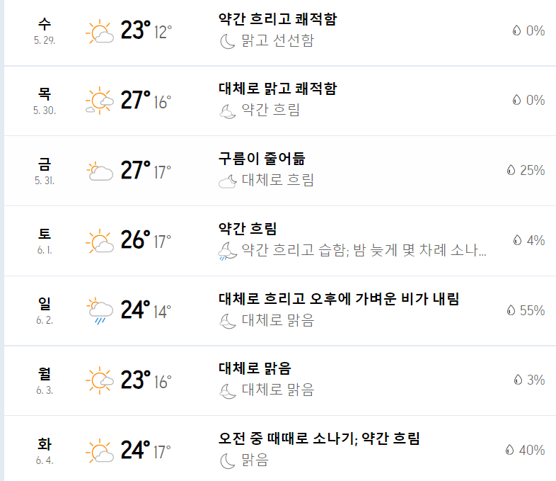 습하진 않지만 해가 강하기 때문에 양산 또는 모자를 챙겨주시면 좋을거 같고 장마를 대비해 작은 우산도 챙기시면 좋습니다.